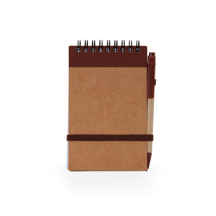 • Descrição: Bloco de anotações ecológico com caneta, feito em kraft com detalhe plástico. Contém aproximadamente 70 folhas brancas com pauta, porta caneta elástico, elástico para lacre e acompanha caneta de papelão com detalhes plásticos, carga esferográfica azul 1.0mm e acionamento por clique.