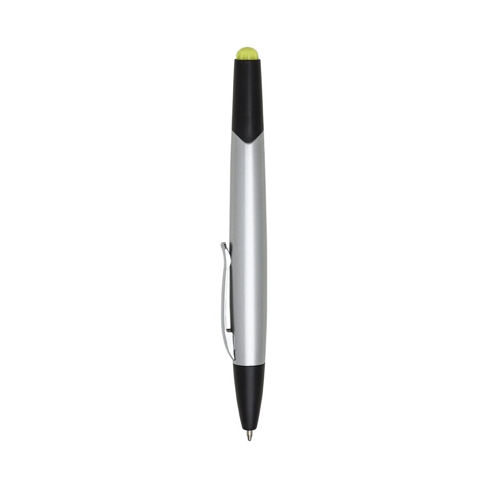 • Descrição: Caneta plástica com marca texto inteira prata com detalhes preto. Clip de metal, para utilizar marca texto basta puxar a tampa preta aonde possui um detalhe colorido sinalizando o marca texto e do outro lado esferográfica aciona por giro.