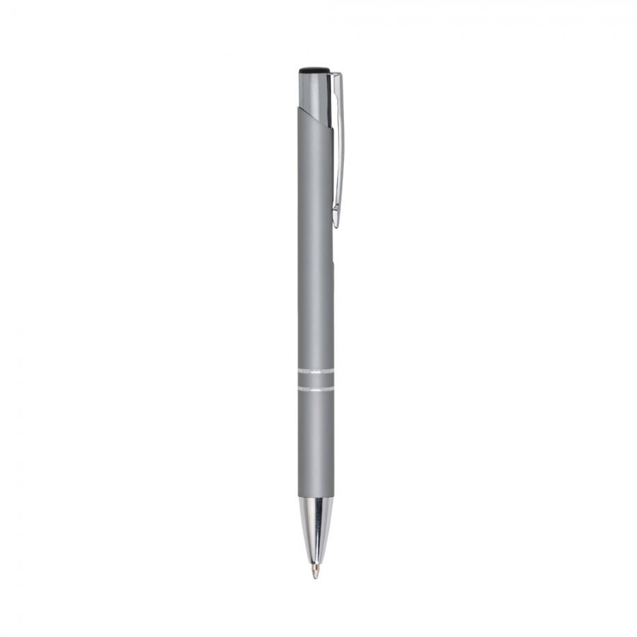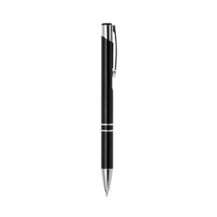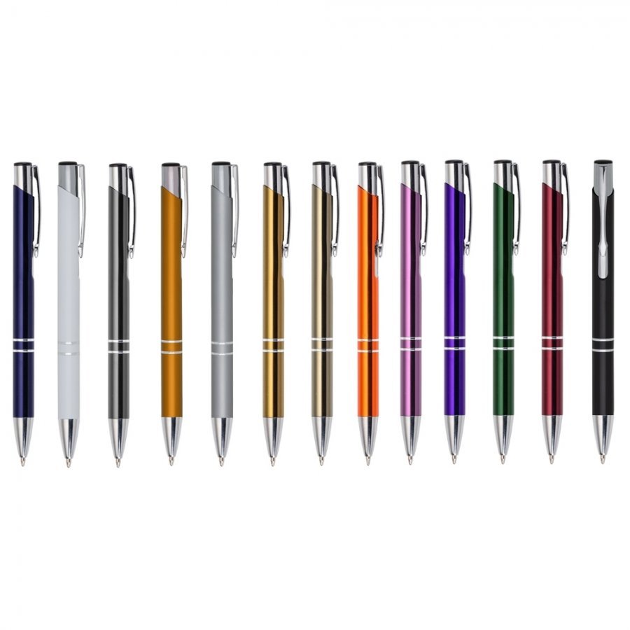 • Descrição: Caneta metal colorida com detalhes prata. Clip metal com a ponta do acionador preto, parte inferior com dois anéis prata. Aciona por clique.