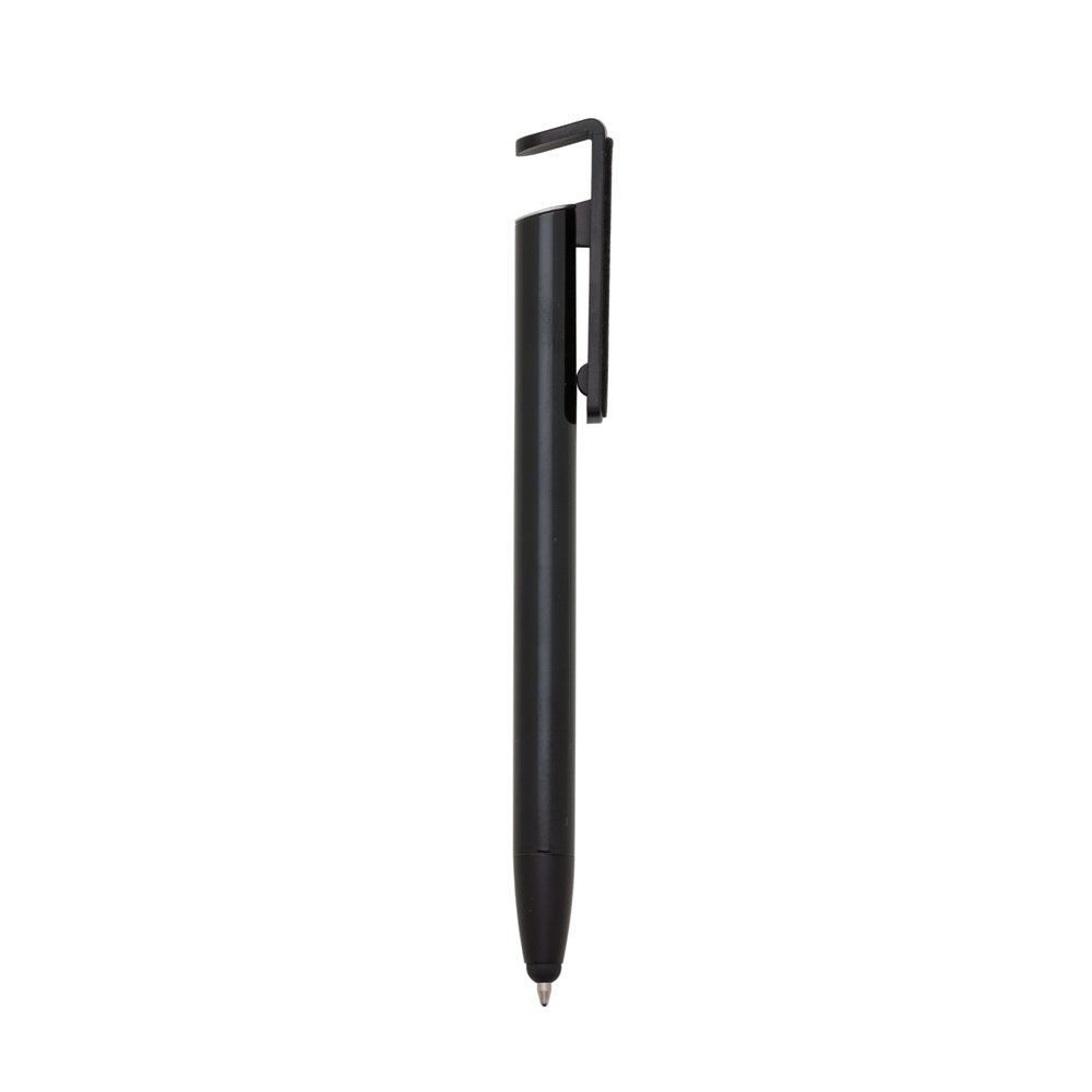 • Descrição: Caneta metal multifunções. Corpo colorido e detalhes preto, possui clip com limpador de teclado e parte superior vazada para ser utilizada como suporte para celular. Parte inferior com borracha touch, aciona por clique.