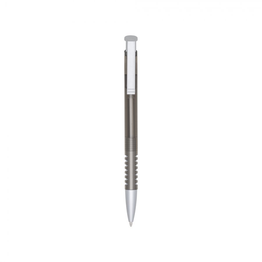 Descrição: Caneta plástica com carga esferográfica azul e acionamento por clique.