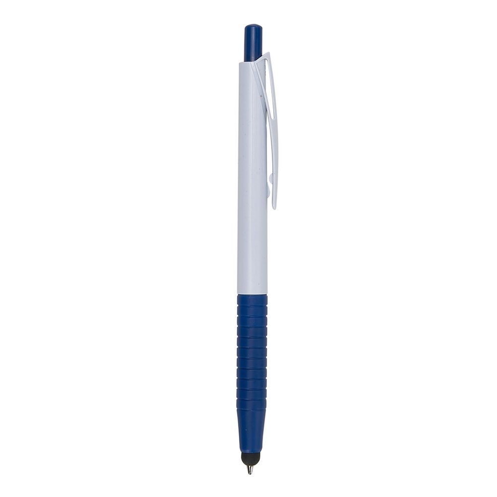 • Descrição: Caneta plástica touch de corpo branco com detalhes coloridos. Borracha touch inferior, clip plástico com detalhe vazado nas laterais, acionador e parte inferior colorida com oito anéis em relevo. Aciona por clique.