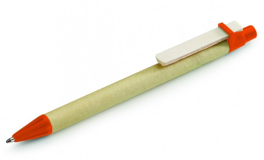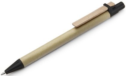 • Descrição: Caneta ecológica de papelão com detalhes coloridos. Clip de madeira e ponteira plástica, possui relevo na ponteira. Aciona por clique.