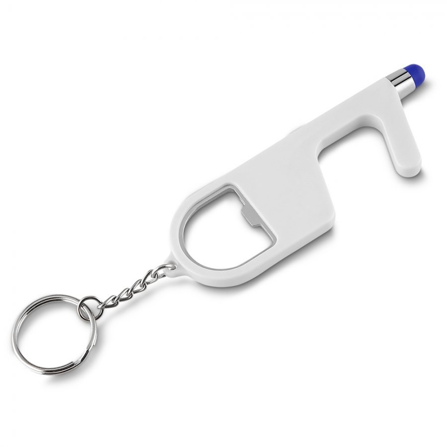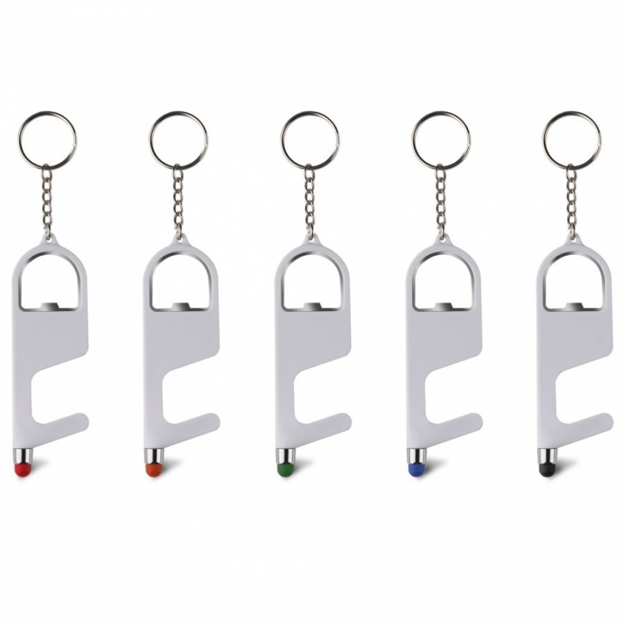 Chaveiro plástico de material antibacteriano com funções de abridor de garrafa, touch screen e aciona superfícies sem o contato físico.