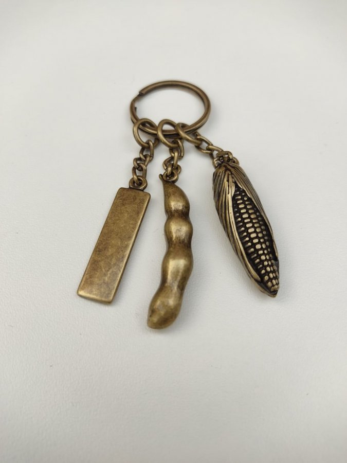 Chaveiro em ouro velho contendo 01 milho, 01 soja e 01 plaquinha personalizada.