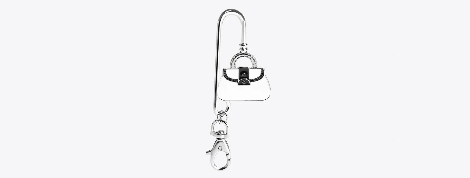 • Com Acabamento em Cromado Brilhante, formato de bolsa e mosquetão.