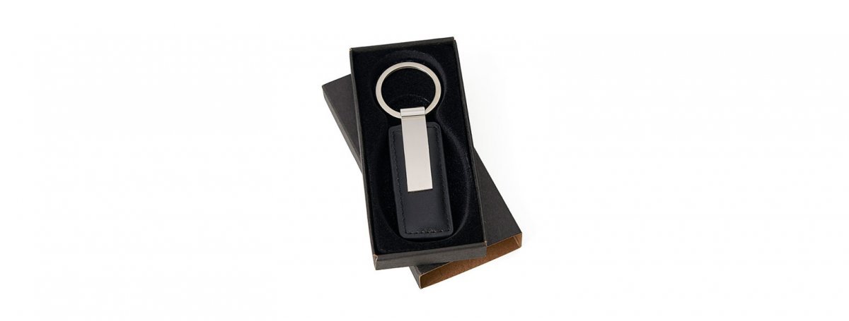 • Chaveiro em Metal cromado e Material Sintético preto. Conta com placa de Metal e acabamento em costura lateral.