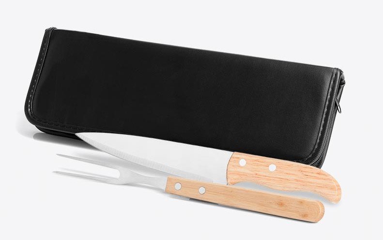 • Conjunto para churrasco contendo faca 7″ e garfo • Embalagem: Estojo sintético • Personalização: A laser na faca