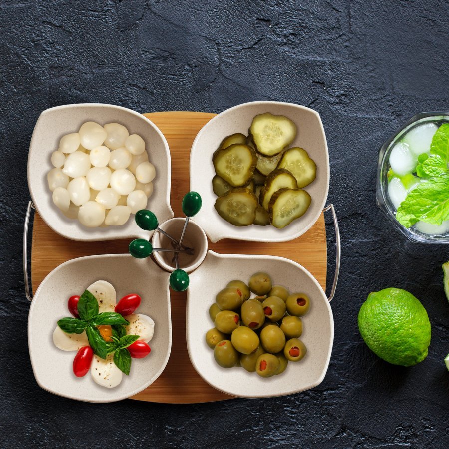 • Descrição: Conjunto para petisco em Bambu/Fibra de Bambu; Acompanha cinco potes em fibra de Bambu; Quatro garfos em Aço Inox com ponta em formato de azeitona; Base em Bambu com alças em Aço Inoxidável.
