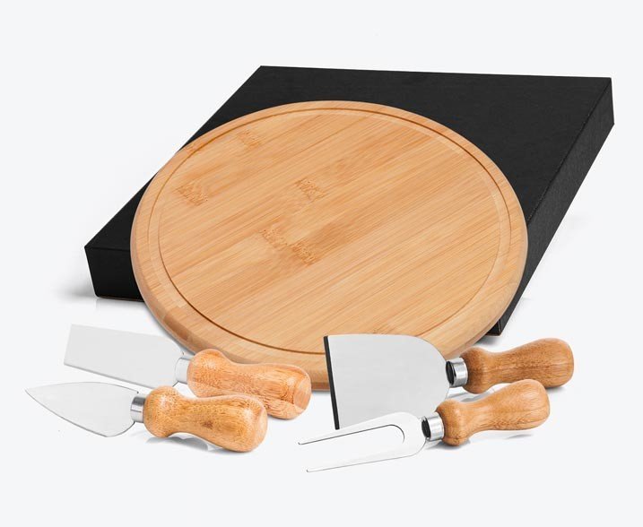 • Descrição: Kit para queijo. Conta com tábua redonda em bambu; três facas e garfo para queijos. Tábua confeccionada com tripla camada invertida, para dar maior durabilidade e não deformar com o passar do tempo.
