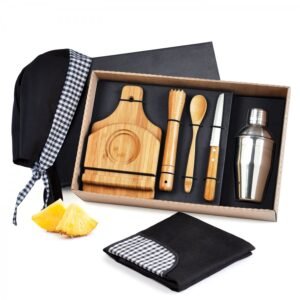 • Descrição: Kit composto por seis acessórios para caipirinha, sendo um copo em vidro de 350ml, um socador/pilão em Bambu, uma faca para frutas de 4” em aço Inox/Bambu, uma colher em Bambu de 18cm e uma tábua pequena em Bambu com cabo e orifício.