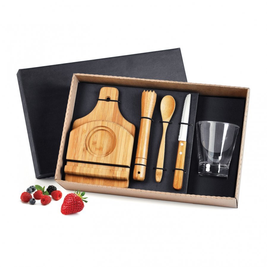 • Descrição: Kit caipirinha com tábua em Bambu, faca para frutas 4″ em Inox/Bambu, pilão, colher de 18cm e base para a tábua em Bambu e copo em Vidro. Acomodados em uma linda caixa para presente. Capacidade da copo: 350ml.