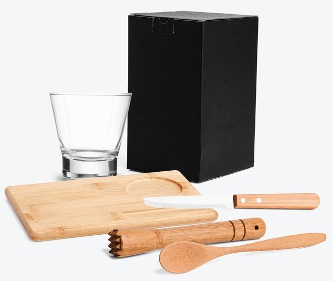 • Descrição: Kit para caipirinha em Bambu. Conta com tábua, colher e socador em Bambu; faca em Bambu/Inox; copo em Vidro.