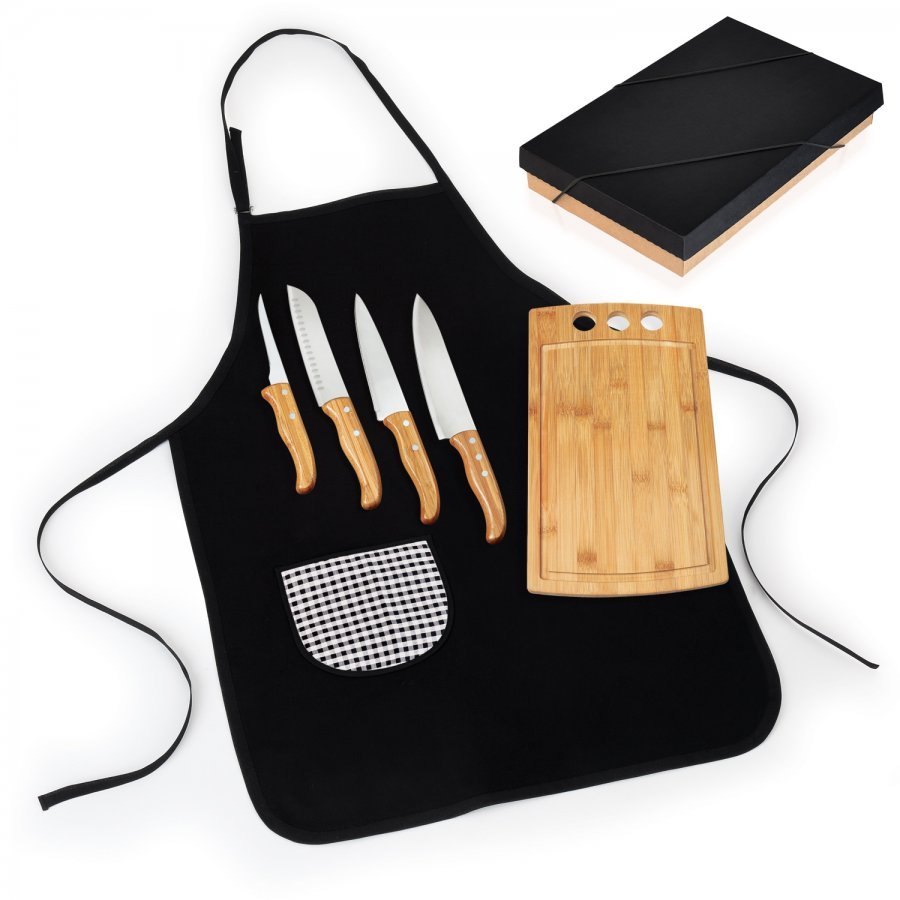 • Descrição: Kit para Churrasco em Bambu/Aço Inox com avental; Acompanha tábua em Bambu com sulco, faca 8”, faca 7″, faca Santoku e faca 5″ para desossar e avental com bolso em Brim preto. Acomodados em uma linda caixa para presente. Tábua confeccionada com tripla camada invertida, para dar maior durabilidade. • Dimensões: Tábua: 37×22,5×1,2cm • Personalização: Uma gravação a Laser na tábua e na lâmina da faca 8″ e em Silkscreen no avental.