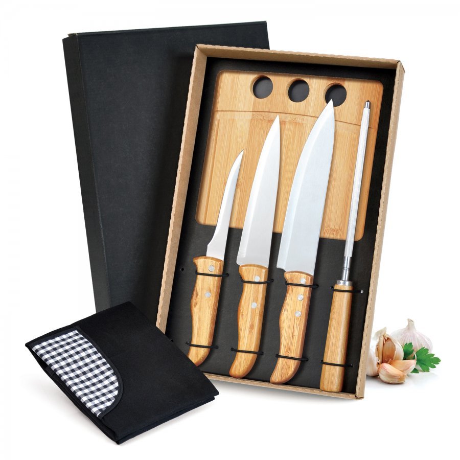 • Kit para Churrasco em Bambu/Aço Inox com avental. Acompanha tábua em Bambu com sulco, faca 8”, faca 7″, faca 5″ para desossar, chaira e avental com bolso em Brim preto. Acomodados em uma linda caixa para presente. Tábua confeccionada com tripla camada invertida, para dar maior durabilidade.