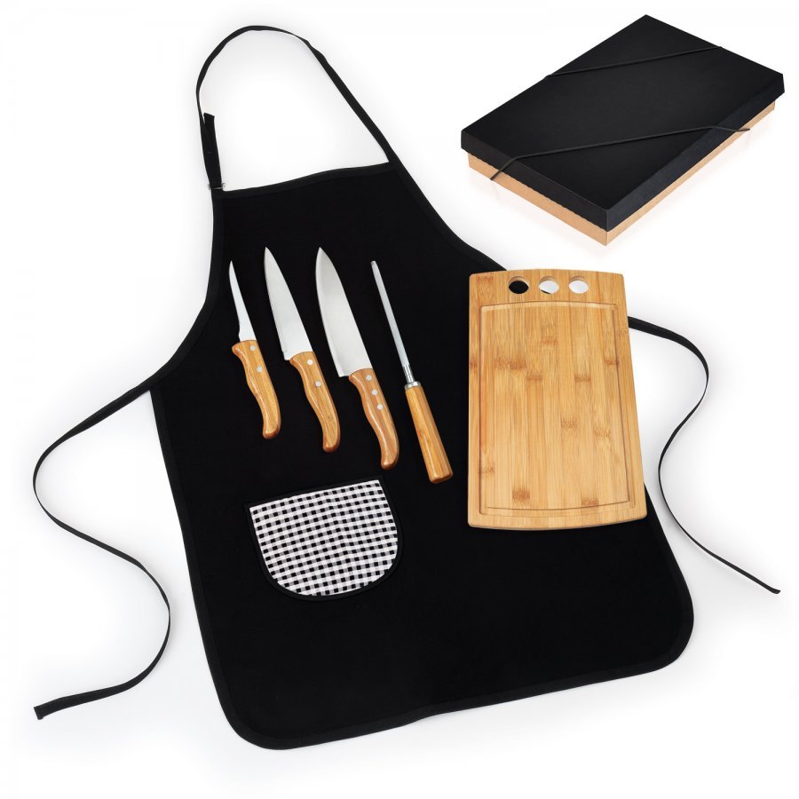 • Uma gravação a Laser na tábua e na lâmina da faca 8″ e em Silkscreen no avental.