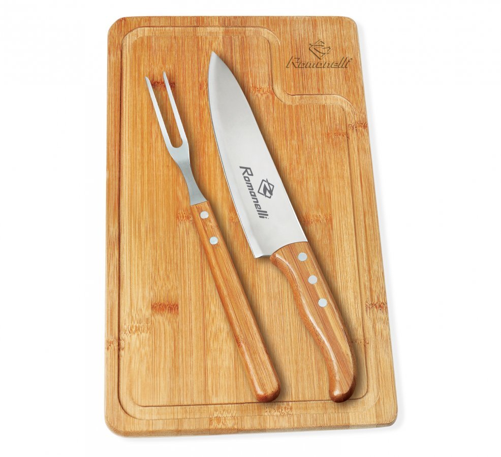• Descrição: Kit para churrasco; Conta com tábua em Bambu; Faca 8″ e garfo em aço Inox/Bambu. Tábua confeccionada com tripla camada invertida, para dar maior durabilidade e não deformar com o passar do tempo. Rebites em Aço Inox 304, um dos mais resistentes à ferrugem e corrosão.