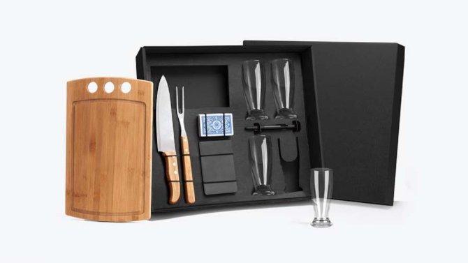 • Descrição: Kit para Churrasco / Cerveja / Truco. Acompanha tábua com três furos em Bambu; faca 8” e garfo em Bambu/Inox; quatro copos de cerveja em Vidro; bloco de anotação; caneta esferográfica; jogo de cartas. Tábua confeccionada com tripla camada invertida, para dar maior durabilidade e não deformar com o passar do tempo.
