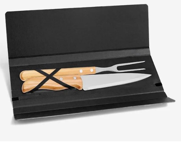 • Conjunto composto por uma faca 7” e um garfo trinchante, ambos com cabos em bambu e lâminas em aço inox com rebites resistentes. Estão organizados em uma pasta preta com elásticos