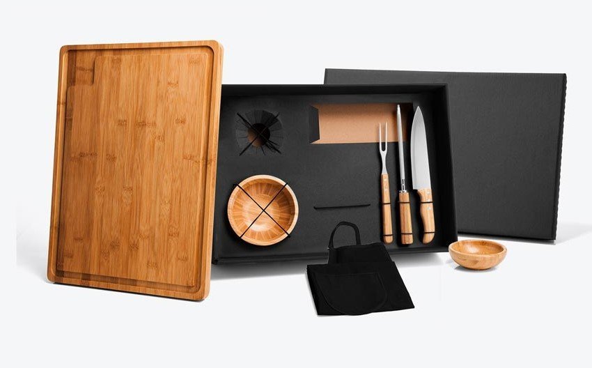 • Personalização: Uma gravação a Laser na tábua, na lâmina da faca 8″ e na caixa; em silkscreen no avental.