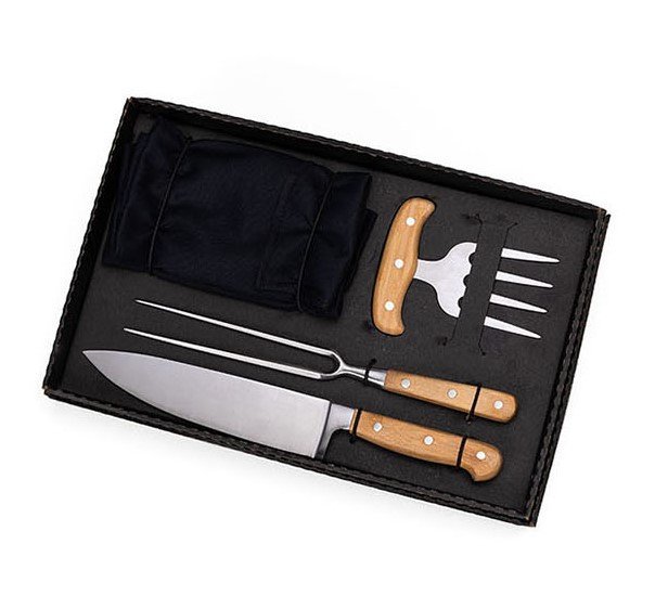• Descrição: Kit para Churrasco; Conta com faca 8”, garfo 4 dentes e garfo trinchante em Bambu/Inox; Avental em Brim. Faca e garfo trinchante em Aço Forjado AISI420.