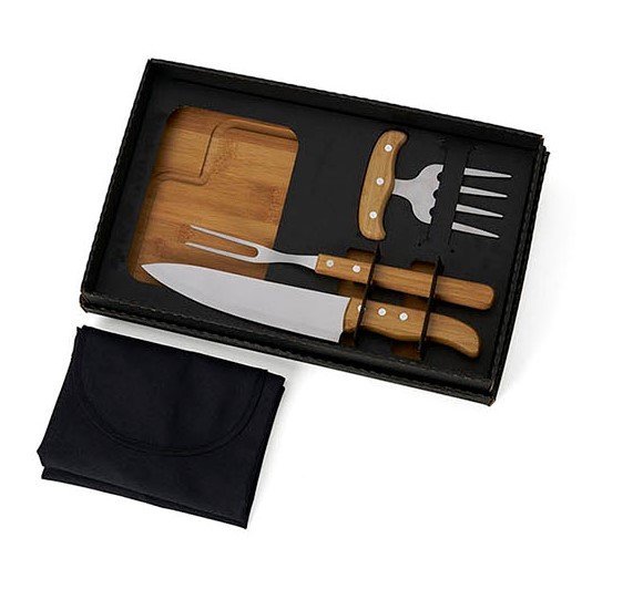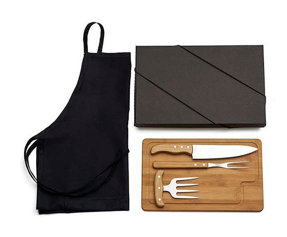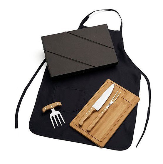 Kit para churrasco. Conta com tábua em Bambu; faca 8”, garfo 4 dentes e garfo trinchante em Bambu/Inox; avental em Brim.