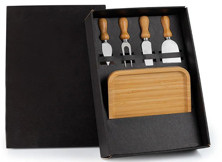 • Descrição: Kit para petisco / queijo. Conta com petisqueira em bambu; três facas e garfo para queijo.