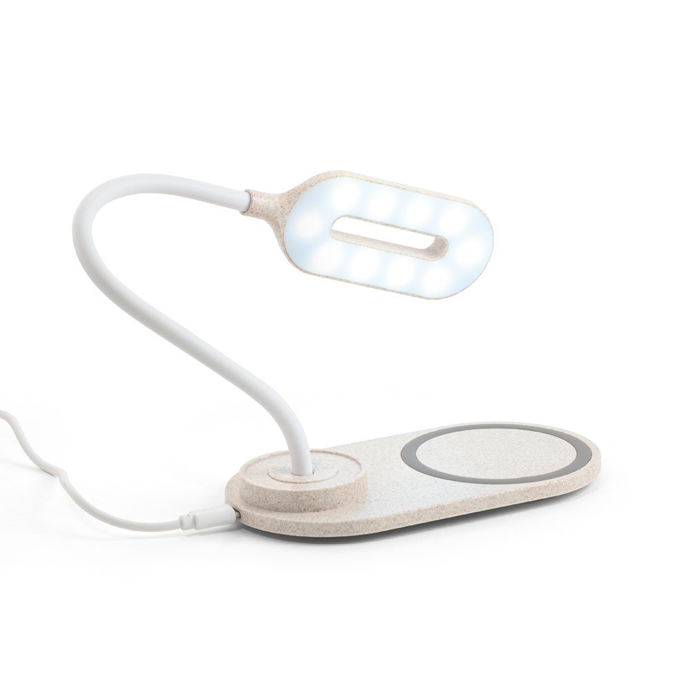 Luminária de mesa em ABS e fibra de palha de trigo com carregador wireless. A haste é flexível para ajustar a direção da luz e contém 20 LEDs que permitem uma iluminação até 3 níveis de intensidade. No topo da luminária encontra-se um botão touch para ligar, desligar e ajustar os níveis de iluminação. O carregador sem fios é de carregamento rápido, tendo uma potência até 10W, com entradas 5V/2A e 9V/1.67A. No local onde o equipamento é colocado tem um círculo com silicone para evitar que se mova. Incluso cabo micro USB de 1 m. Fornecido em caixa presente de papel craft. 160 x 268 x 85 mm