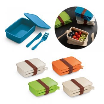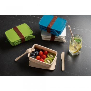 • Marmita hermética em fibra de bambu (50%) e PP (50%) com banda elástica com suporte para 2 talheres, inclusos: garfo e faca.