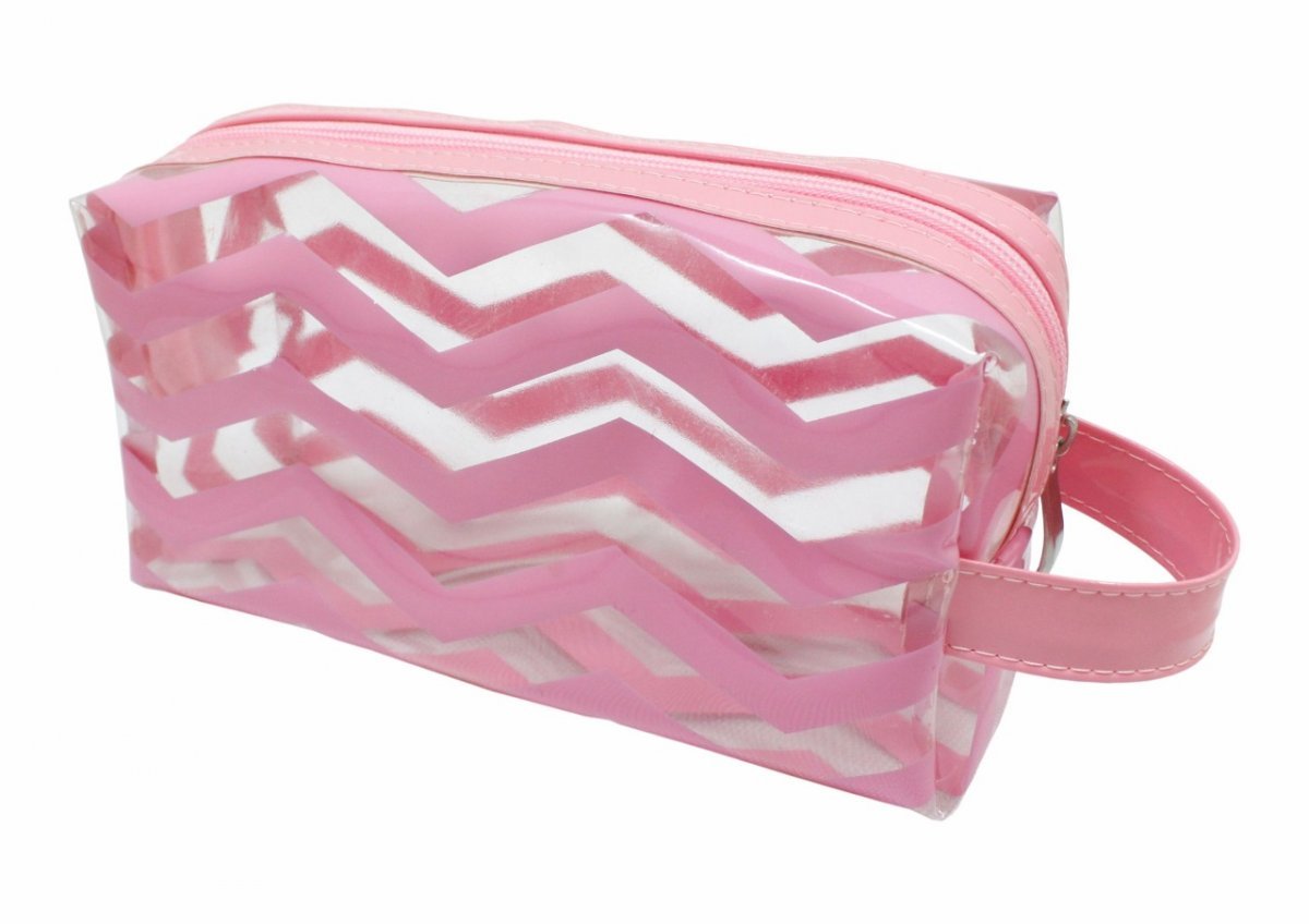 • Descrição: Necessaire em PVC transparente 0,30 com detalhes em verniz, ziper e alça.