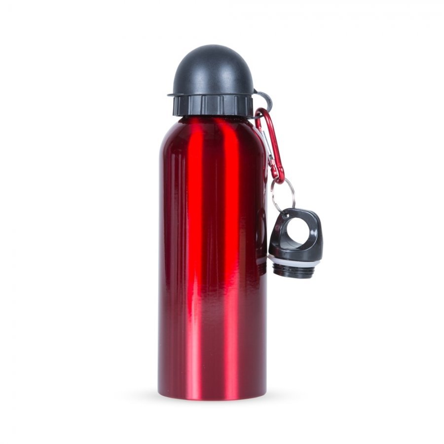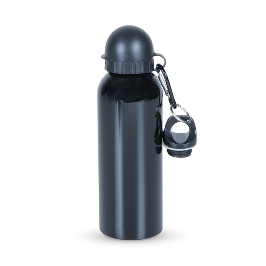 • Descrição: Squeeze de alumínio com pintura metalizada, tampa rosqueável e acompanha um segundo bico com mosquetão (não é térmico).